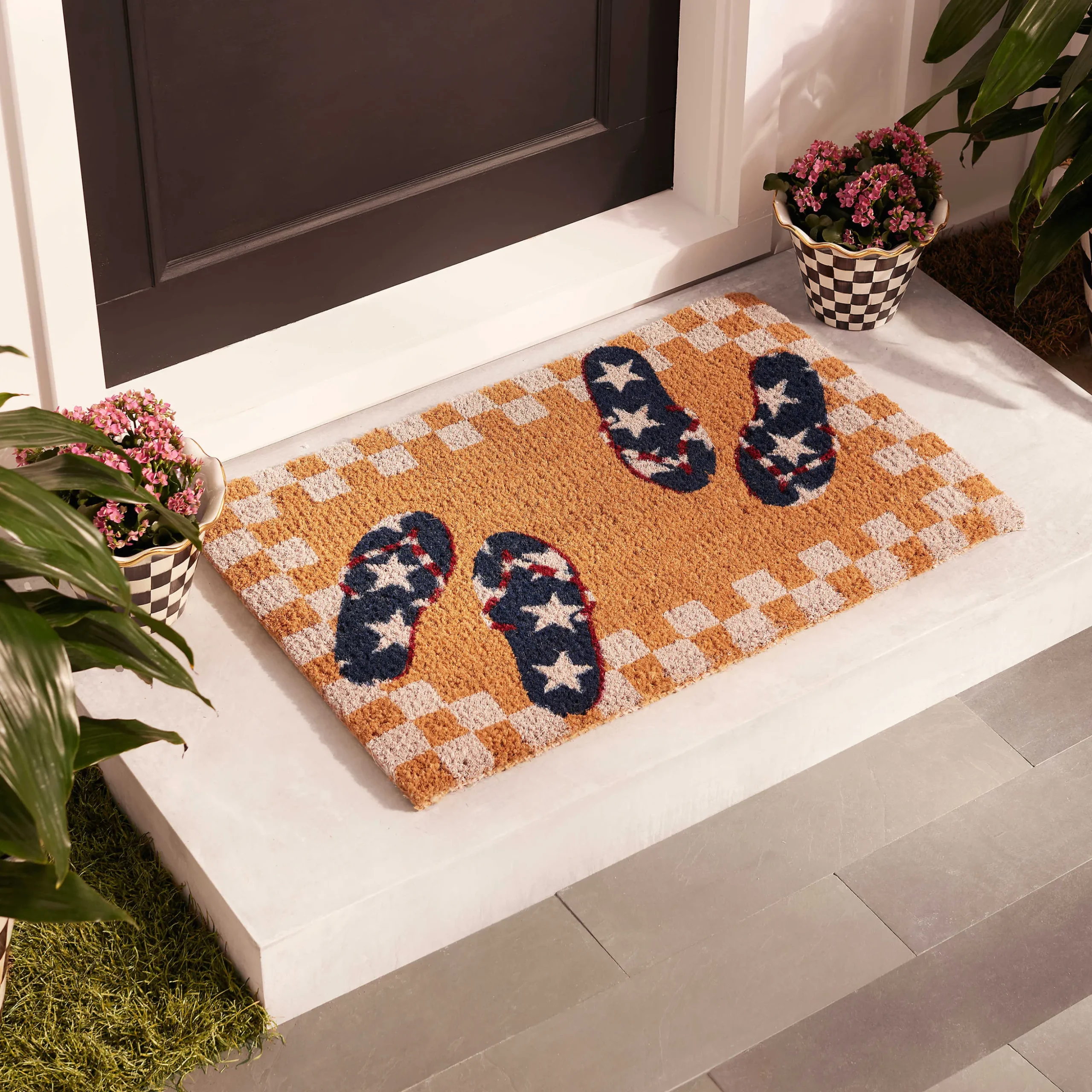 Say Hello To Summer With The Flip Flops Entrance Mat. It’S Made Of Natural Materials With A Printed Image Of Flip Flops, Bordered In Checks. Use It In Protected Areas, And When Its Useful Life Is Over, You Can Recycle This 100% Biodegradable Mat By Burying It In Your Garden!