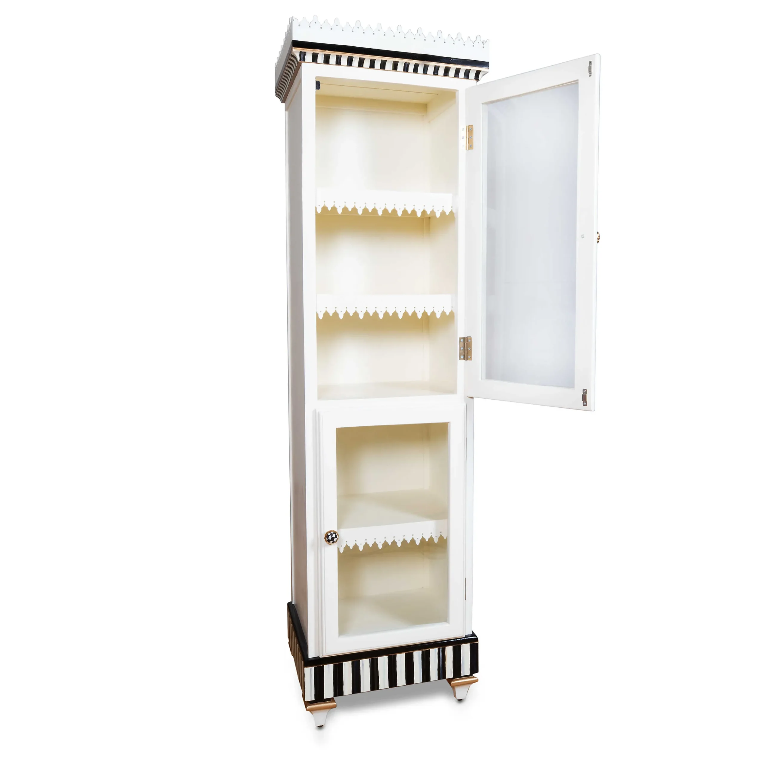 You Can Never Have Too Much Storage, Especially When It Is As Charming As Our Apothecary Curiosity Cabinet. With A Fresh White Finish, It’S Trimmed With Hand-Painted Courtly Stripe And Topped With Gingerbread Moulding. Inside Two Glass-Front Doors, Which Have Magnetic Closures, There Are Three Fixed Shelves.