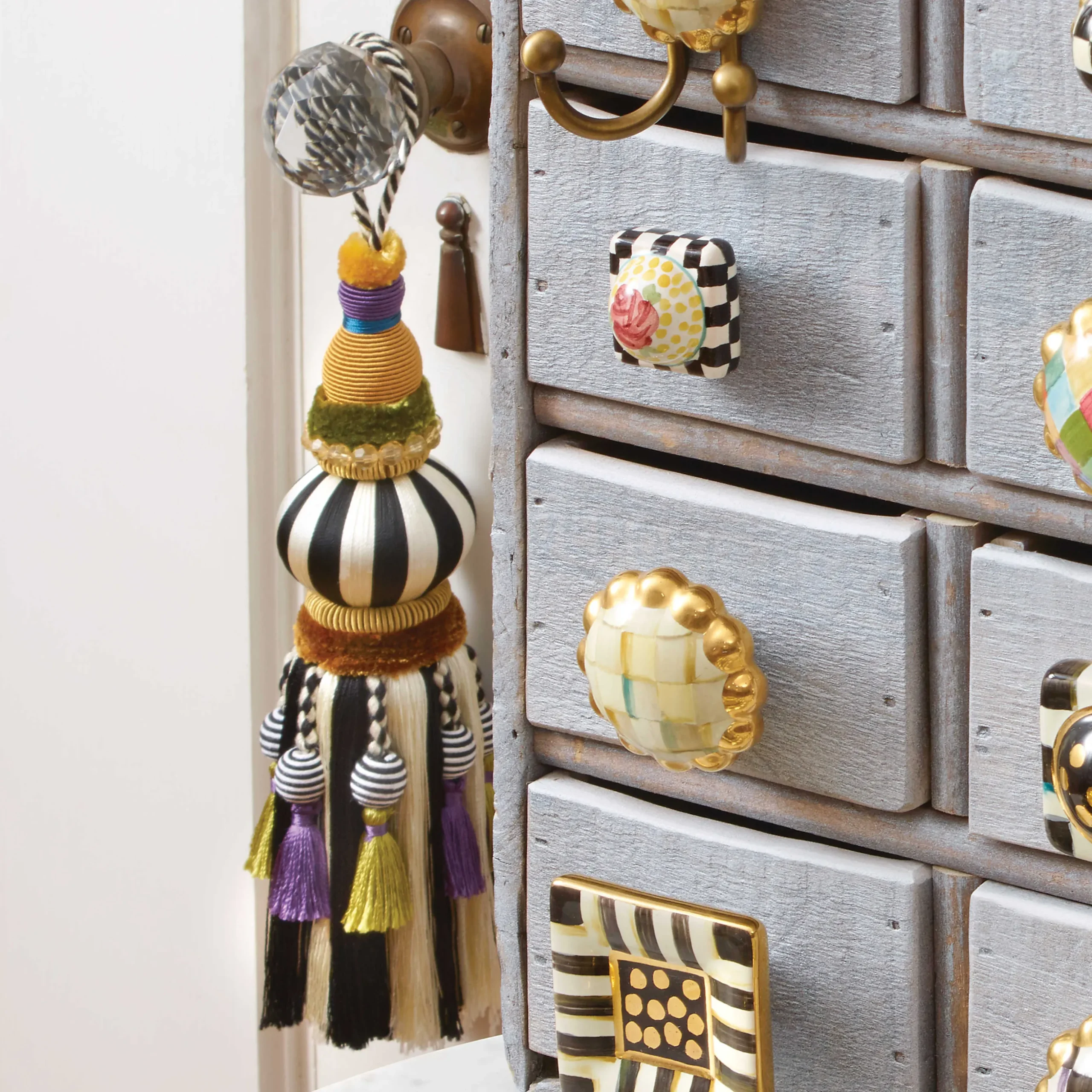 Pull It All Together With Color Combinations From The Mackenzie-Childs Palette. The Thread-Covered Wooden Black & White Bibelot Tassel Features Poly/Rayon Silks And Bead Embellishments.