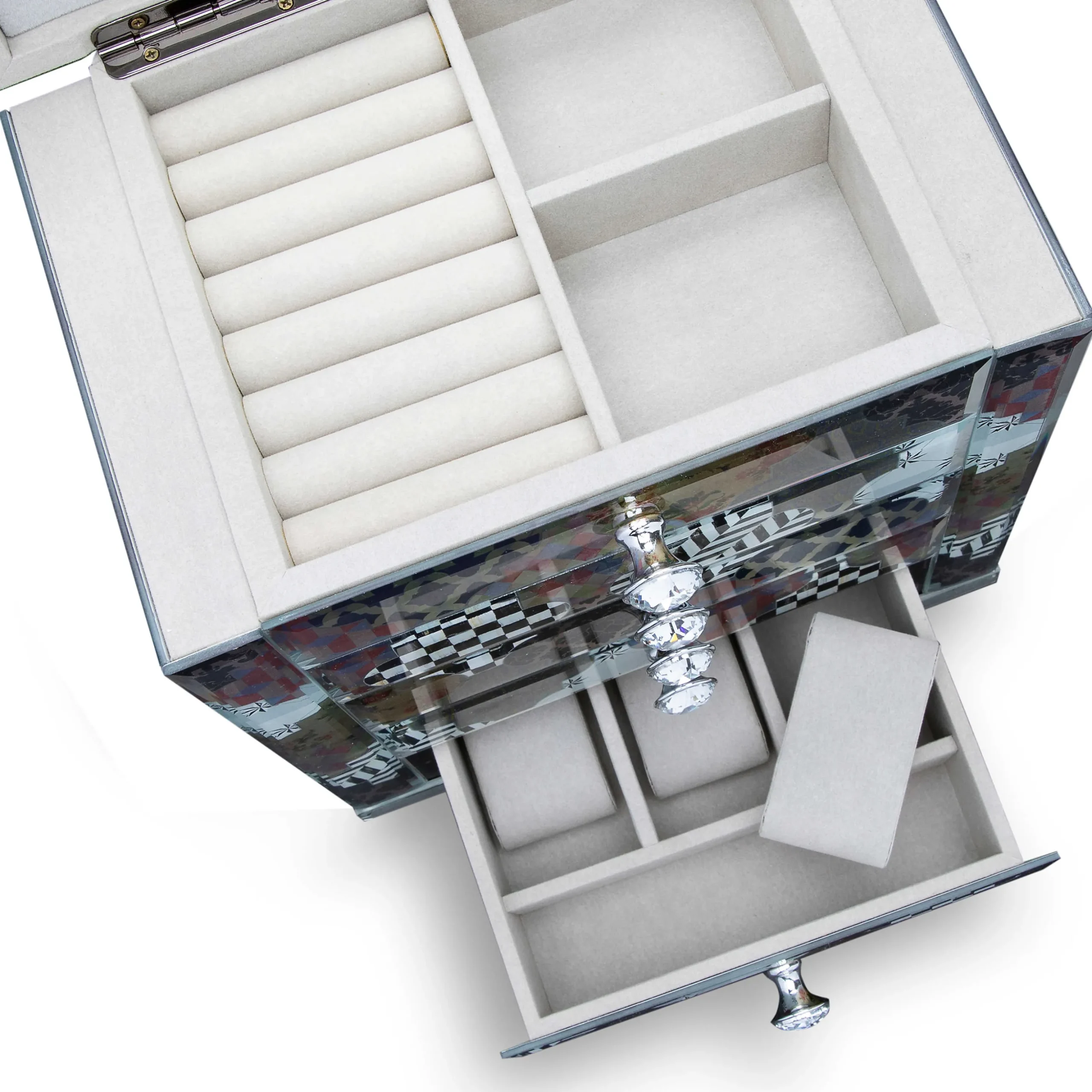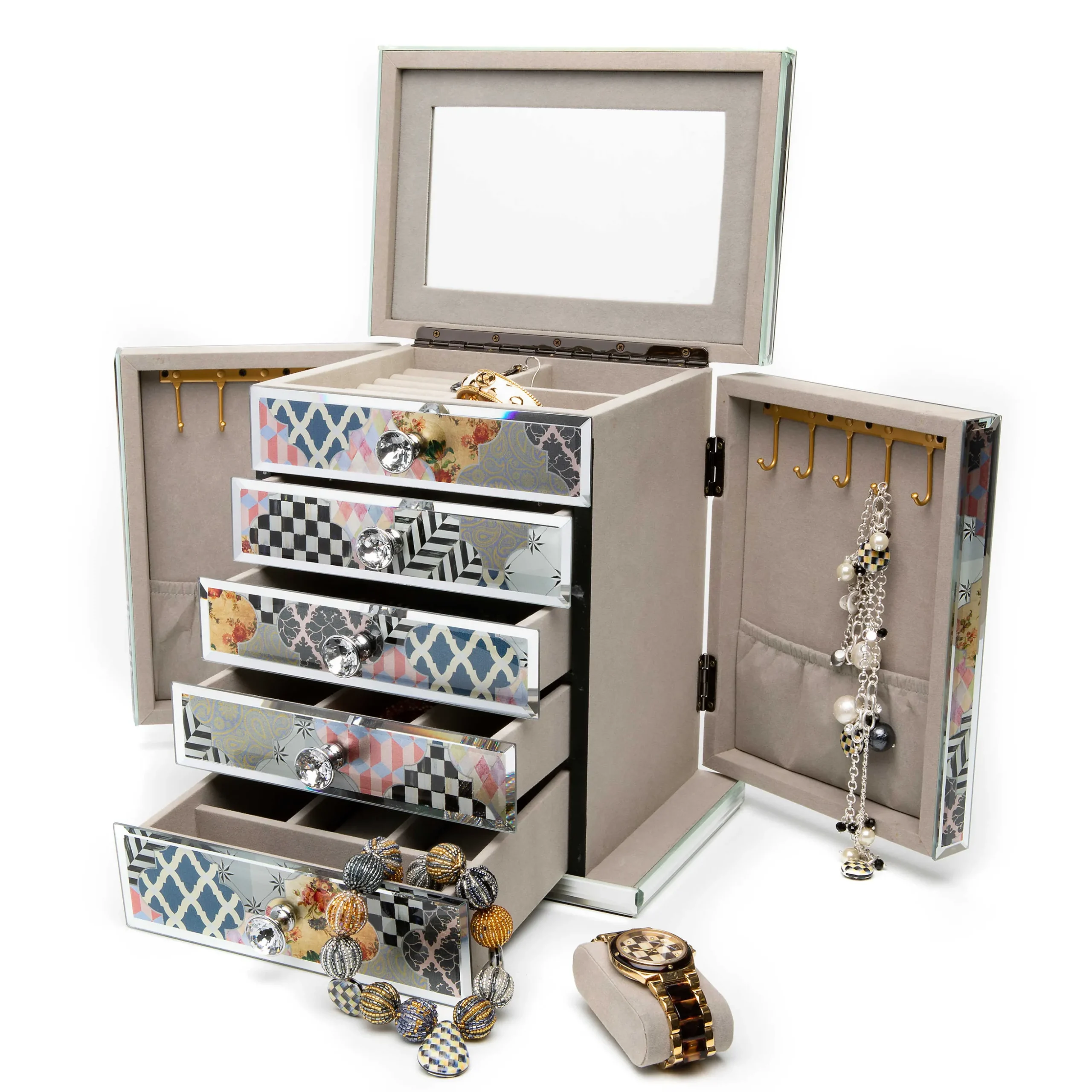 Give Your Treasured Jewelry A Home That’S Equally As Pretty. Our Venezia Jewelry Armoire Is Decorated With A Patchwork Of Iridescent Patterns Printed On Mirrored Glass, Finished With Beveled Edges. This Fabulous Piece Is Also Functional, With Four Working Drawers That Have A Variety Of Storage Options. Also, The Sides Open To Hold Necklaces And There’S A Mirror Inside The Lid.